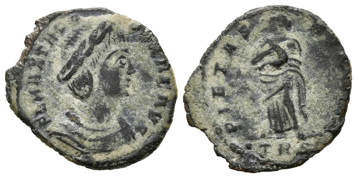 English THEODORA. Follis. (Ae. 1.20g / 17mm). 337-340 AD Treveri. (RIC 91). Anv: Diademic and draped bust of Teodora on the right, around legend: FL MAX THEO-DORAE AVG. Rev: Pietas standing to the right with child in her arms, in exergue: TRS, around legend: PIETAS - ROMANA. Almost Very Fine.