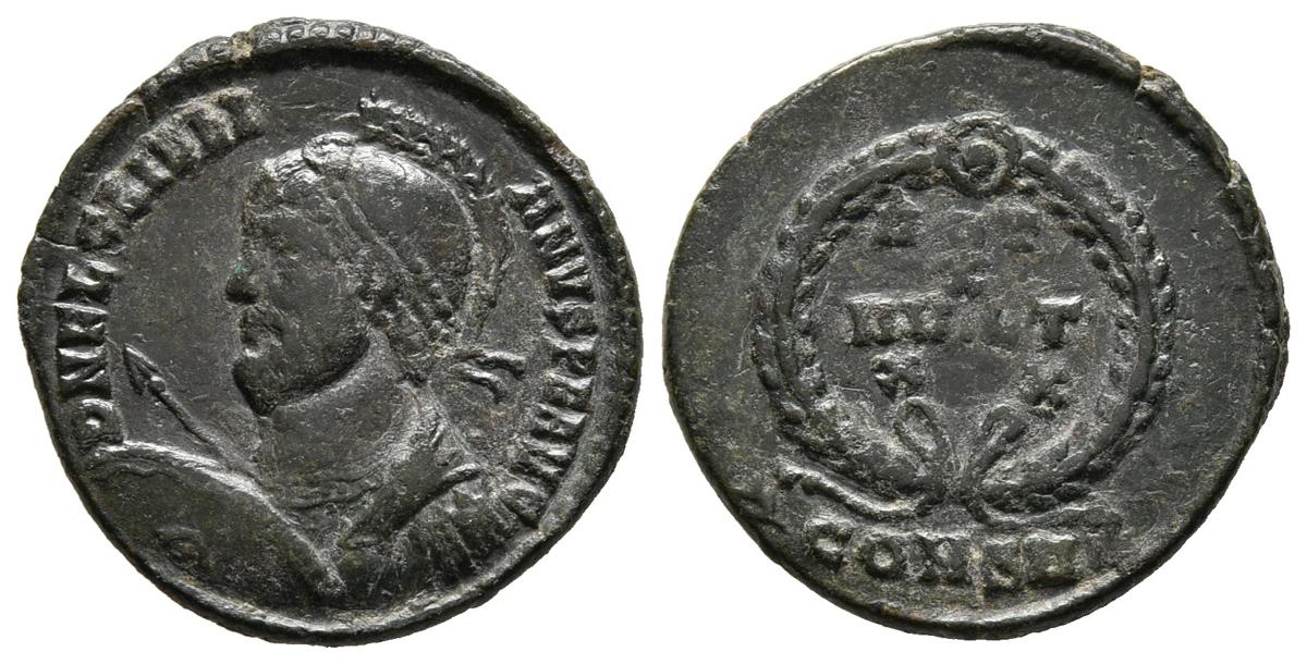 JULIAN II. Follis. (Ae. 3.13g / 20mm). 361-362 AD Constantinople. (RIC 166). Anv: Diademic bust with helmet and cuirass on the left carrying spear and shield, around legend: DN FL CL IVLIANVS PF AVG. Rev: Legend: VOR X MVLT XX, inside laurel wreath, below: CONSA. Very Fine.