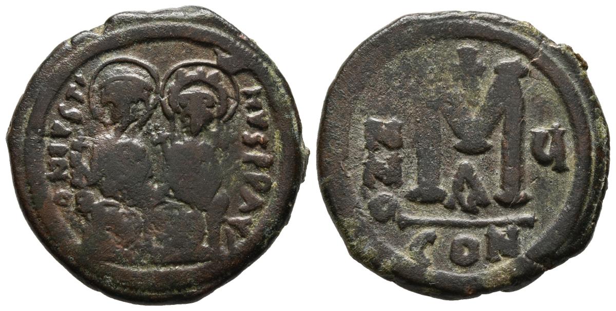 JUSTINO II with SOPHIA. Follis. (Ae. 12.64g / 29mm). 570-571 AD Constantinople. (Seaby 360). Anv: Justin II and Sophie front shelves, around legend: DN IVSTINVS PP AVG. Rev: M, above cristogram, below mongram, in exergue: CON. Very Fine.