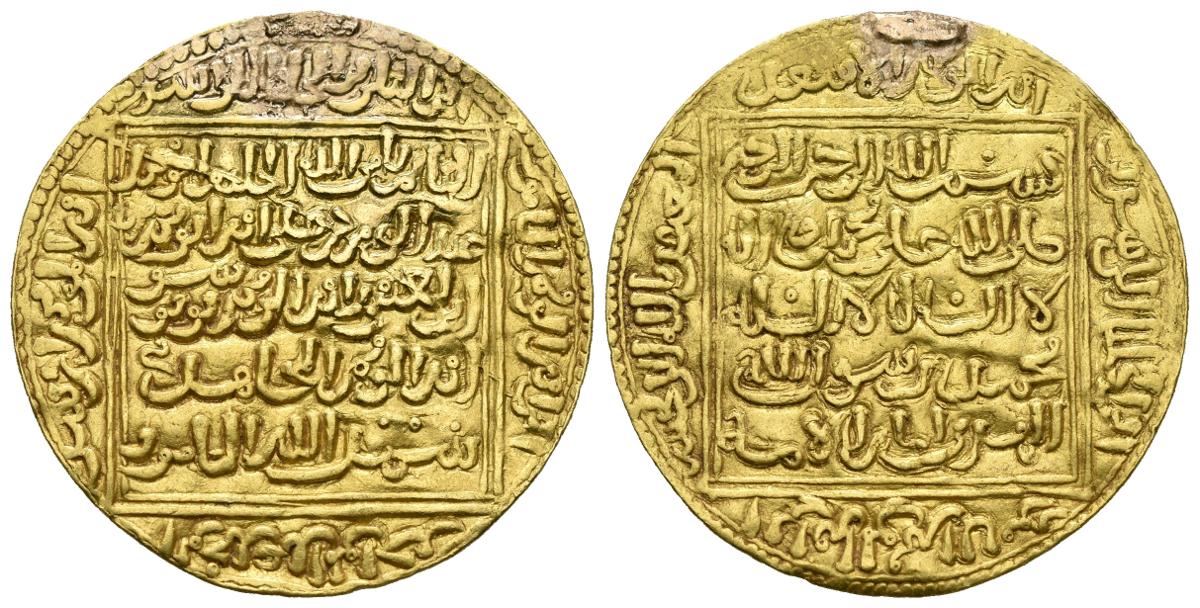 Almohads. Abu al-Hasan Ali ibn Idris I (640-646H). Fold. (Au 4.61g / 31mm). (Vives 2078; Hazard 519). In the last line of the IIA, the Koranic expression reads: "al-jahidu fi sabil Allah" (effort in the way of God). Good Very Fine. Remains of crimping at 12 o'clock. Very rare.