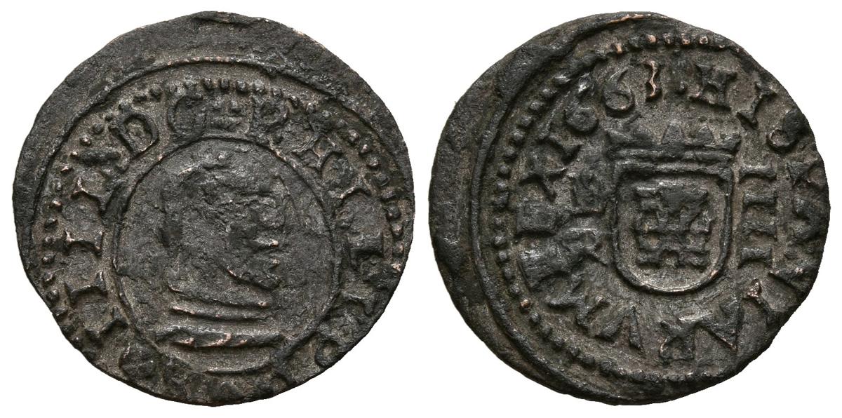 FELIPE IV (1621-1665). 4 Maravedís (Ve. 1.00g / 17mm). 1663. Burgos. (Cal-2019-188). R in reverse. Very Fine.
