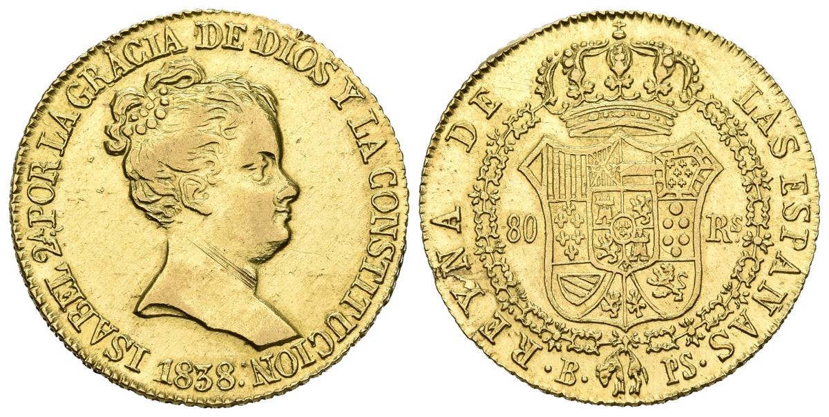 English ISABEL II (1833-1868). 80 Reales. (Au 6.74g / 21mm). 1838. Barcelona PS. (Cal-2019-701). CONSTITUTION in the legend on the obverse. Almost Extremely Fine. Limited.