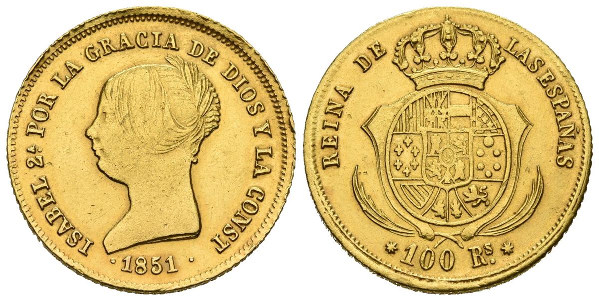 English ISABEL II (1833-1868). 100 Reales. (Au 8.36g / 22mm). 1851. Sevilla. (Cal-2019-793, listed as RRR). Very Fine. Rare and probably unpublished.