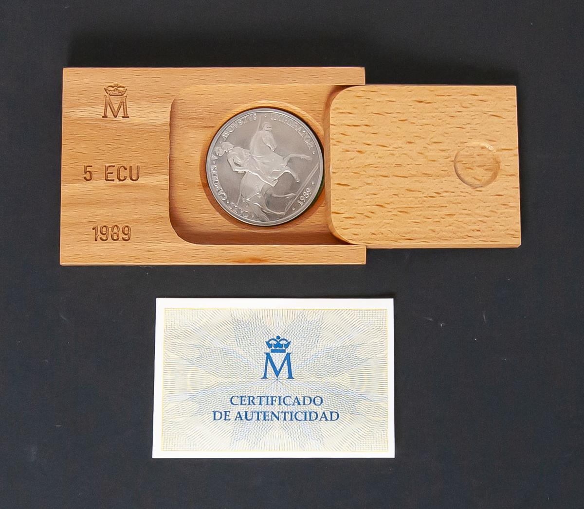 English JUAN CARLOS I (1975-2014). 5 Ecu. (Ar. 33.62g / 42mm). 1989. Carlos V. FNMT. FDC. Includes official box and certificate of authenticity. 250 thousand mints.
