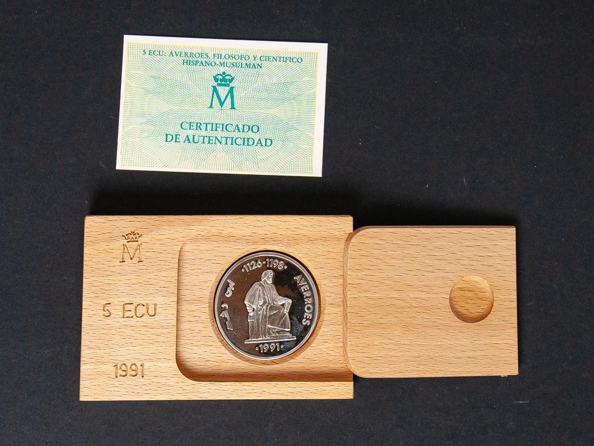 English JUAN CARLOS I (1975-2014). 5 Ecu. (Ar. 33.62g / 42mm). Averroes. 1991. FDC. 50,000 units. Includes official box and certificate of authenticity.