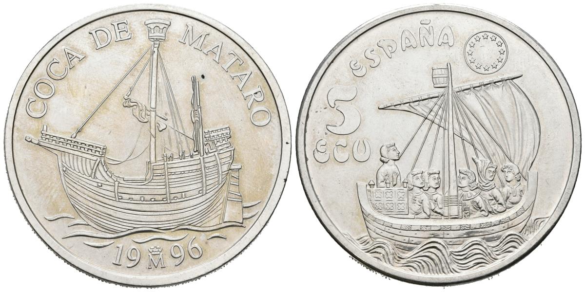 JUAN CARLOS I (1975-2014). 5 Ecu. (Ar. 33.39g / 42mm). 1996. Coca de Mataró. Almost Uncirculated.