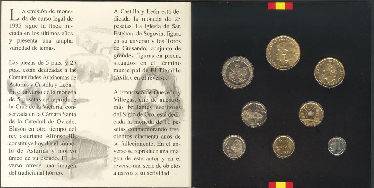 JUAN CARLOS I. Complete set with the values: 1, 5, 10, 20, 25, 25, 50, 100, 200 and 500 Pesetas of 1995. PROOF. Scarce