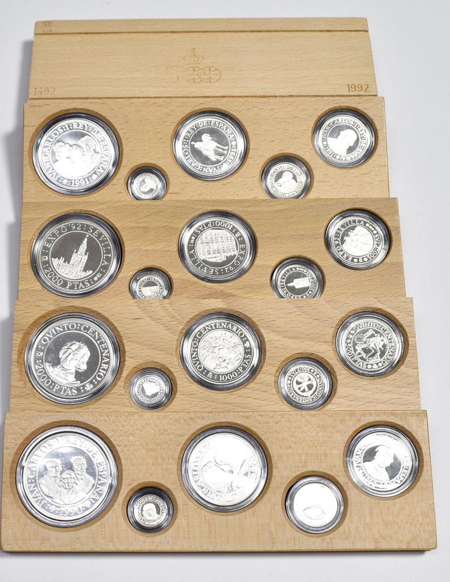 JUAN CARLOS I (1975-2014). Complete collection consisting of 4 cases from the Series of the V Centennial of the Discovery of America (1492-1992). 5 silver values in each case: 2000, 1000, 500, 200 and 100 pesetas. Glitter die flower. Includes original boxes and certificates of authenticity.