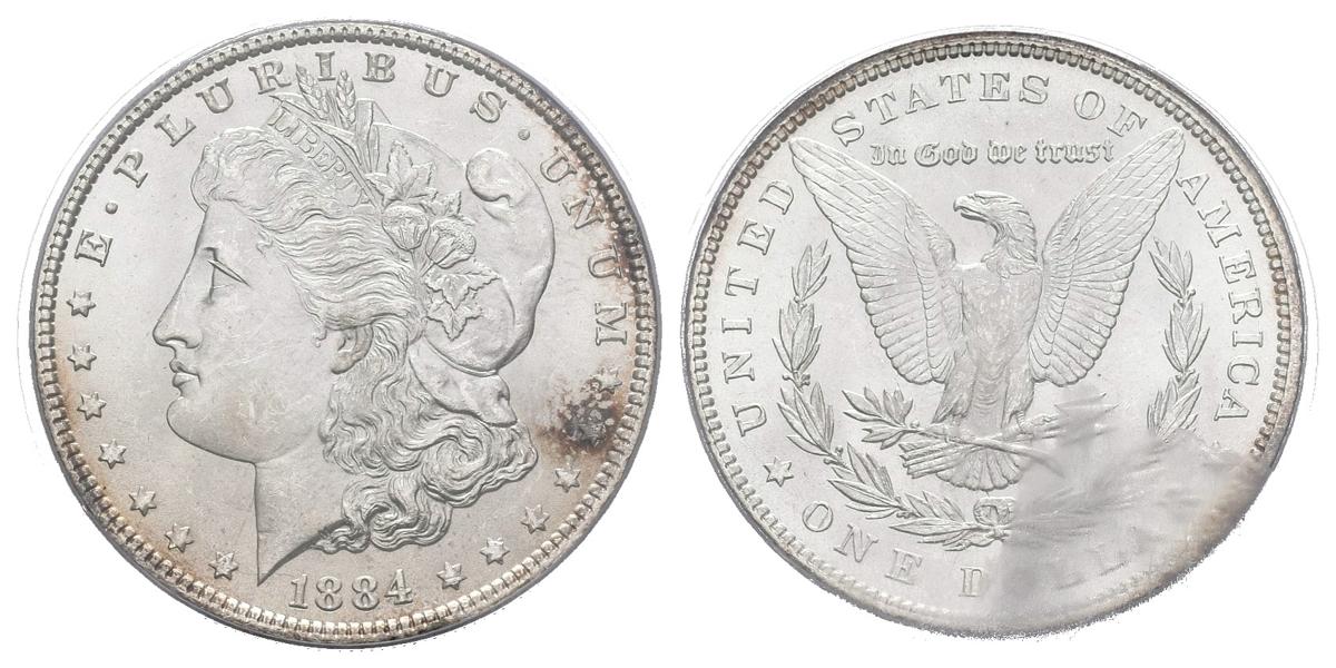 USA. 1 USD (Ar. 26.73g / 38mm) *. 1884. Philadelphia. (Km # 110). MS 64. Encapsulated by PCGS. * Theoretical weight and measure.