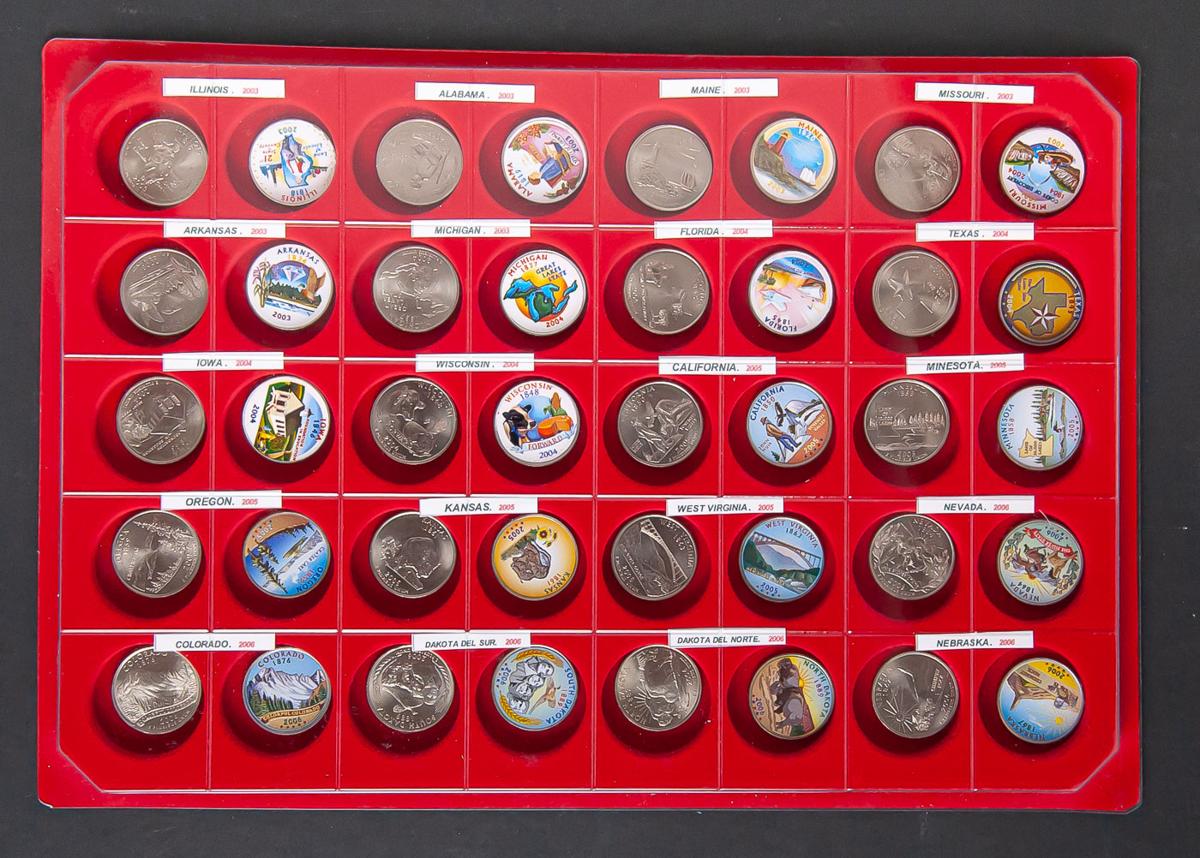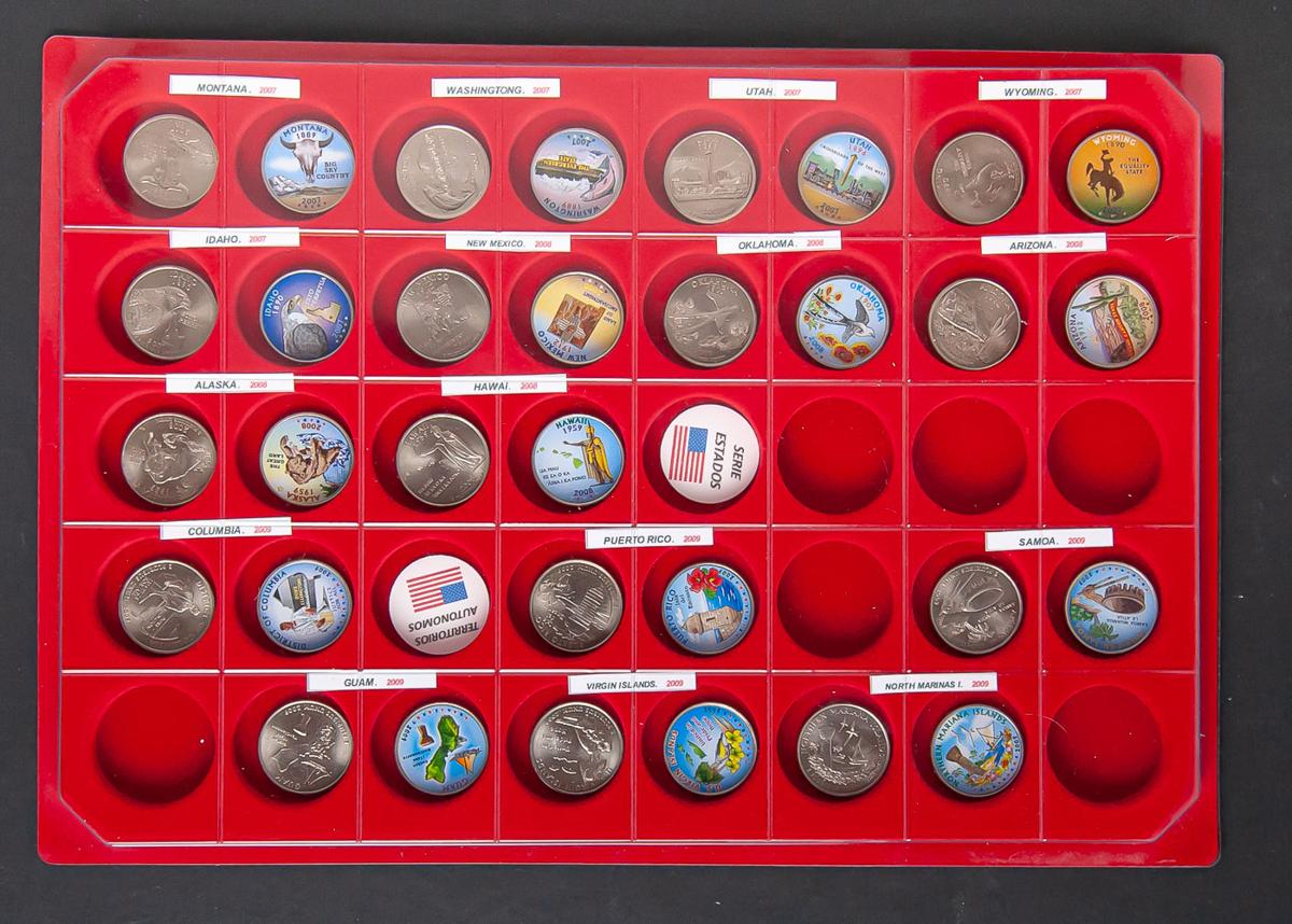 USA. Interesting set made up of 112 coins from the Quarter Dollar series of the Autonomous States and Territories minted in 2007 in original and colored version. Almost complete series. Uncirculated.