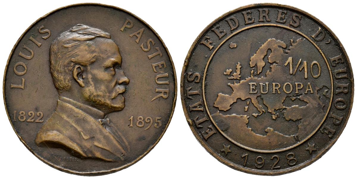 English FEDERATED EUROPEAN STATES. 1/10 Europe (Ae. 13.91g / 32mm). 1928. Louis Pasteur 1822-1895. Europe is a currency created in 1928 by Joseph Archer, mining engineer and mayor of Cizely en Nièvre and promoted by Philibert Besson, MP for Haute-Loire and mayor of Vorey, both founders of the European federation movement. This fantasy coin is seen by many as the germ of the common European currency. (Km # X1). Good Very Fine. Strange.