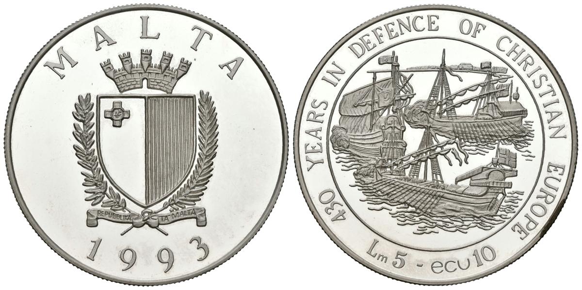 MALT. 10 Ecu. (Ar. 24.99g / 39mm). 1993. 430th Anniversary Defense of Christian Europe. (Km # 104). PROOF.