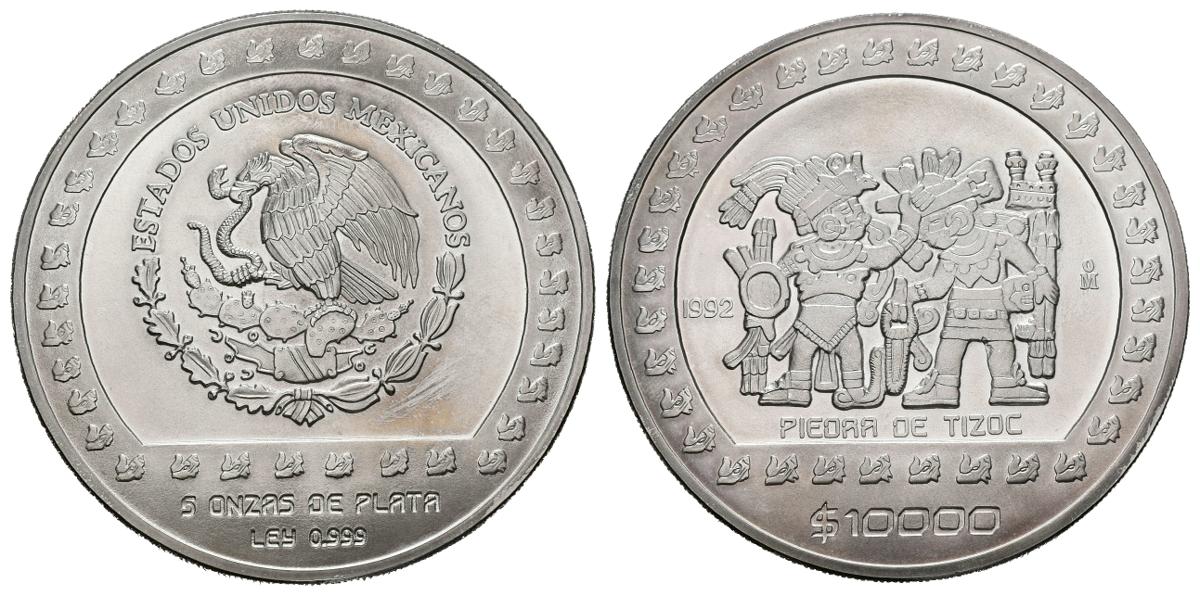 MEXICO. 10,000 pesos. (Ar. 155.73g / 65mm). 1992. Stone of Tizoc. (Km # 557). 0.999 thousandth silver. Uncirculated.