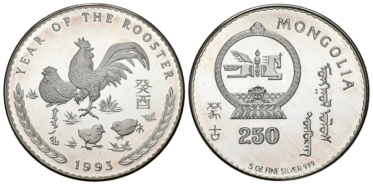 English MONGOLIA. 25 Tugrik. (Ar. 156.48g / 60mm). 1993. Year of the Rooster. (Km # 64). 0.999 thousandth silver. PROOF. Only 300 pieces minted. Includes certificate of authenticity.