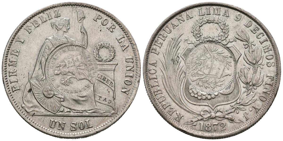 English PERU. 1 Sol. (Ar. 24.92g / 33mm). 1872. (Km # 224). Countermark (De Mey 720y 721). Almost Extremely Fine.