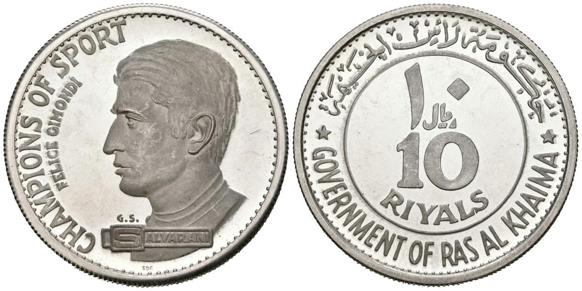 RAS AL-KHAIMAH. (Arab Emirates). 10 Riyals. (Ar. 30.17g / 40mm). 1970. Saqr bin Mohammed Al Qasimi. Felice Gimondi. (Km # 7). PROOF. Very rare.