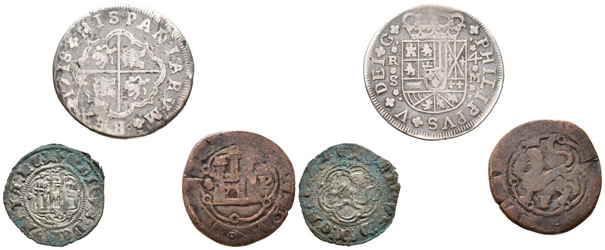English Set of 3 Spanish coins from different periods, medieval and monarchy, and in 3 different materials, copper, fleece and silver including a piece of 4 Reales de Sevilla by Felipe V. Different states of conservation. TO EXAMINE