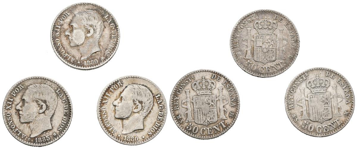 English CENTENARY OF THE PESETA. Set of 3 pieces of 50 cents of Alfonso XII. Years of 1880 and 1885. Different states of conservation. TO EXAMINE.