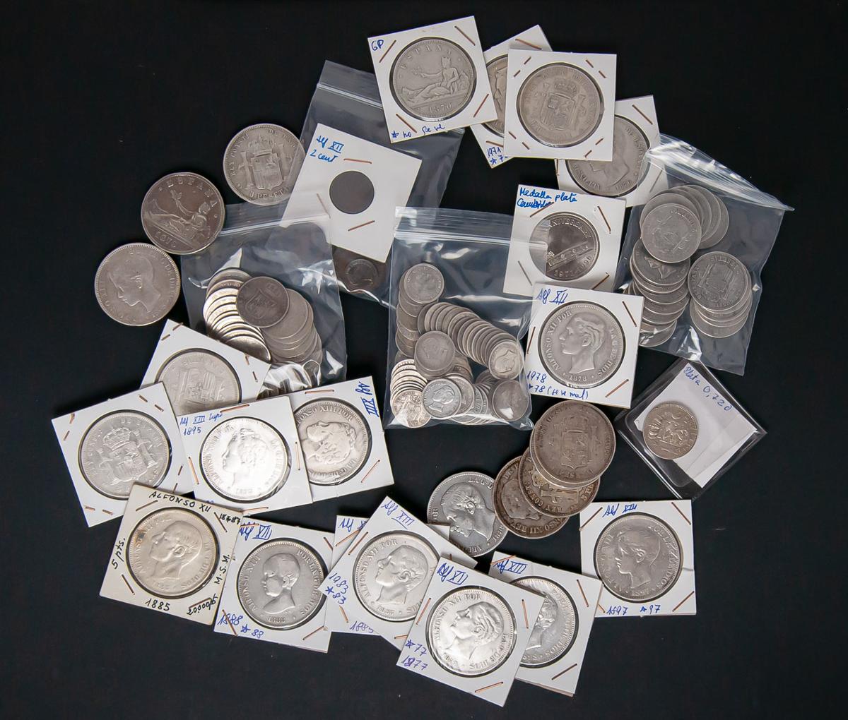 Set consisting of approximately 150 coins, of which 133 are modules between 50 Cents and 5 Pesetas minted between the period of the Provisional Government and the reign of Alfonso XIII. The set includes 24 pieces of the 5 Pesetas module. Also included are a small batch of Spanish coppers, a silver Elizabeth II coin, a British token and 1 Dutch Gulden in silver. Different states of preservation. TO EXAMINE.