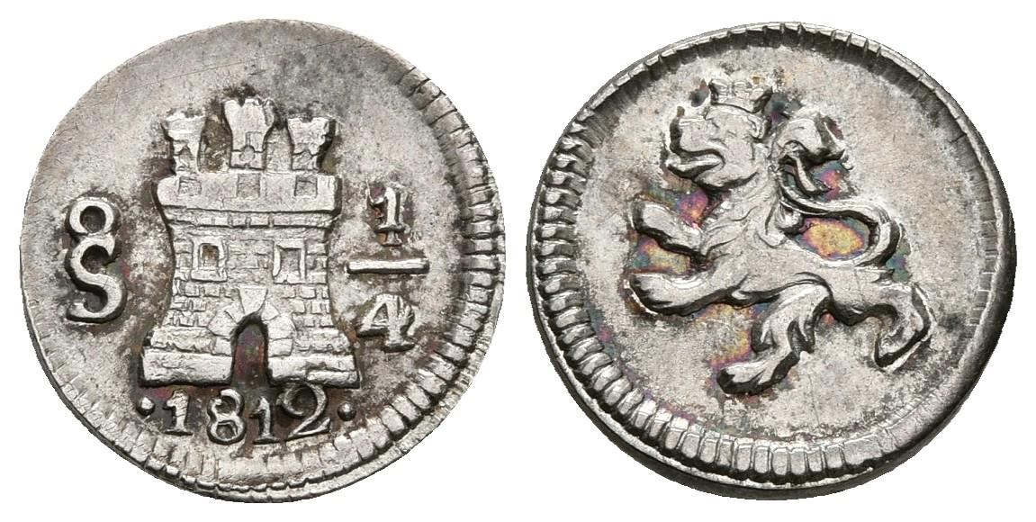 FERNANDO VII. 1/4 Real. 1812. Santiago. El 1 del valor rectificado. El 2 de la fecha grande. Cal-1495. Ar. 0,86g. Preciosa pátina irisada. EBC+. Escasa así.
