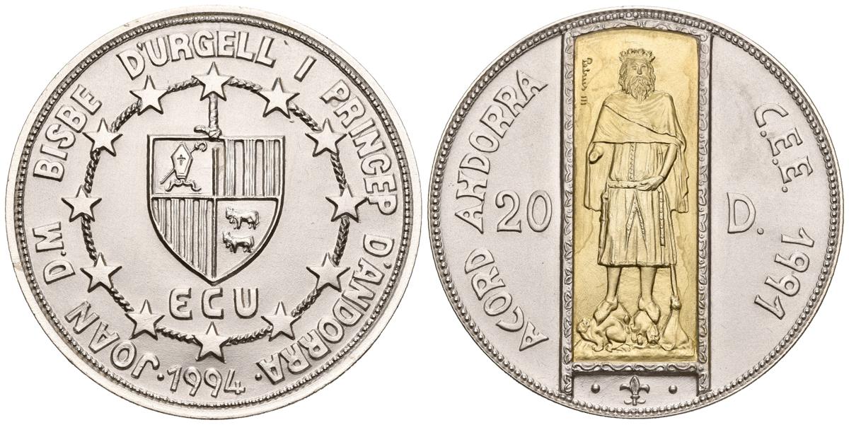 ANDORRA. 1 Ecu. 1994. JOAN D.M BISBE D'URGELL I PRINCEP D'ANDORRA. Ar. 25,15g. Au. 1,50g. PROOF. Sin estuche oficial.