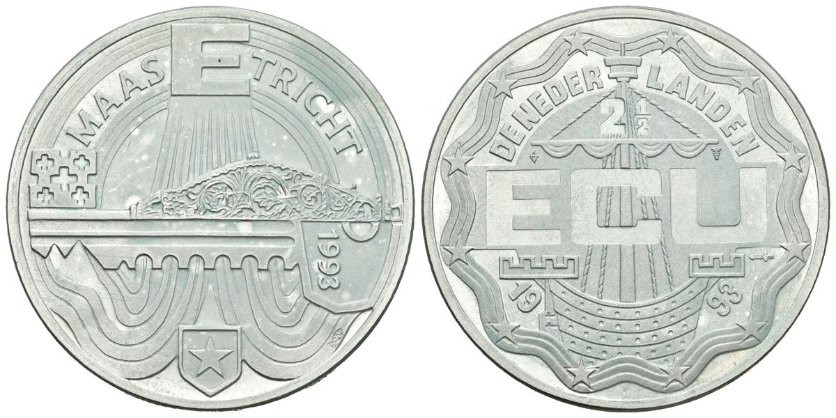 HOLANDA. 2 1/2 Ecu. 1993. MAASTRICHT (tirada: 1500 ejemplares). Ar. 18,32g. Pátina verde. PROOF. Sin estuche oficial.