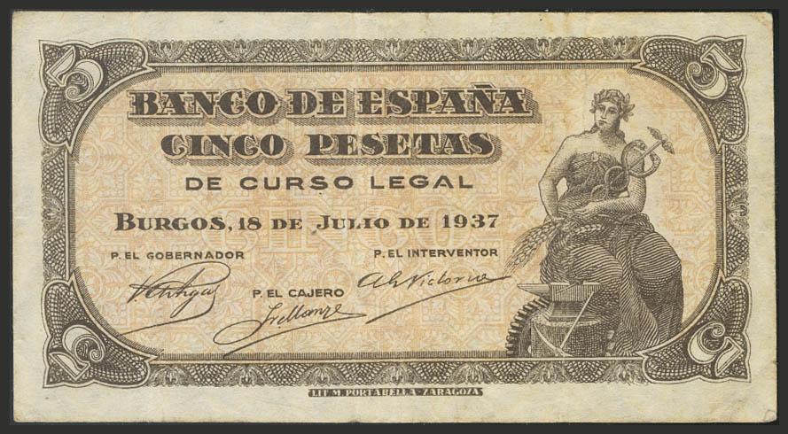 5 Pesetas. 18 de Julio de 1937. Sin serie. (Edifil 2017: 424). Inusual. MBC.