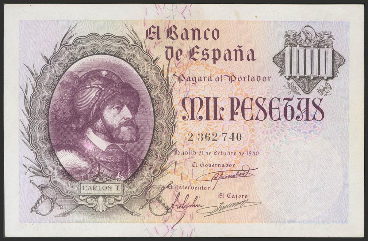 1000 Pesetas. 21 de Octubre de 1940. Sin serie. Puntito reparado. (Edifil 2017: 445). Apresto original. EBC.