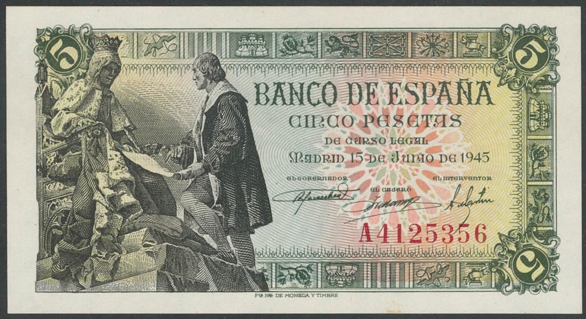 5 Pesetas. 15 de Junio de 1945. Serie A. (Edifil 2017: 449a). SC.