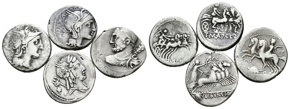 REPUBLICA ROMANA. Lote compuesto por 4 Denarios de la República Romana. C. Claudius Pulcher (Craw 300.1), Ap. Claudius Pulcher (Craw 299.1a), L. Julius Bursio (Craw 352.1a) y T. Quinticius (Craw 297.1). MBC/MBC-. A EXAMINAR.