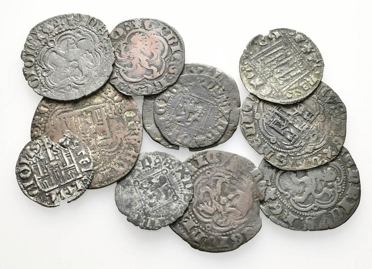 EPOCA MEDIEVAL. Lote compuesto por 11 monedas de la ceca de Sevilla. Sancho IV. Cornado; Alfonso XI. Novén; Enrique III. 1/2 Blanca y Blanca (3); Juan II. Blanca (2) y Enrique IV. Blanca de rombo (2) y Cuartillo. Ve. BC+/MBC. A EXAMINAR.
