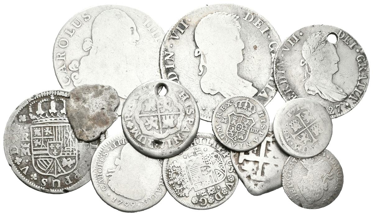MONARQUIA ESPAÑOLA. Lote compuesto por 12 monedas de plata, conteniendo: 1/2 Real y 1 Real macuquinos; FELIPE V. 1/2 Real. 1719. Cuenca; 1 Real. 1738. Madrid; 1 Real. 17XX. Sevilla; 2 Reales. 1720. Madrid. De CARLOS III. 1/2 Real 1785. Madrid y 1787. Guatemala. De CARLOS IV. 1 Real. 1799. Santiago; 4 Reales. 1792. Madrid. Y de FERNANDO VII. 2 Reales. 1827. Sevilla; 4 Reales. 1820 Potosí. Ar. Algunas con perforaciones. BC+/MBC-. A EXAMINAR.