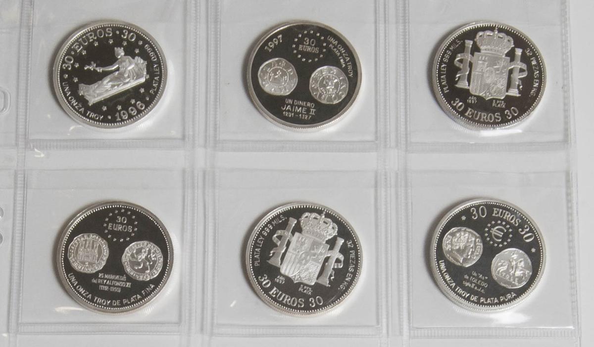 ESPAÑA. Conjunto de 6 monedas de Euro desde 1996 hasta 1998, incluyendo del año 1996: 30 Euros (Ar 31,33g). Del año 1997: 30 Euros (Ar 31,26g), 30 Euros (Ar 31,21g), 30 Euros (Ar 31,22g) y 30 Euros (Ar 31,12g). Del año 1998: 30 Euros (Ar 31,08g). Peso total de plata: 187,22g. A EXAMINAR. PROOF. Todas las monedas sin estuche oficial.