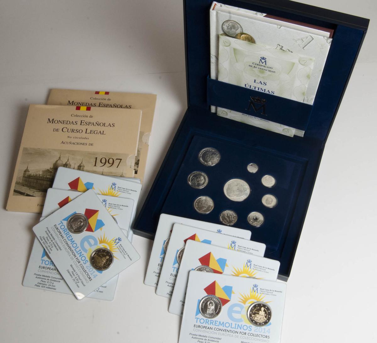CONTEMPORANEO. Lote compuesto por Estuche oficial de "Las últimas Pesetas" 2000-2001 realizadas en plata, 2 carteras oficiales de 1997 y 10 blisters de Torremolinos del 2014 (2 Euros Gaudí Proof y prueba de la medalla de la comunidad autónoma de Andalucía). SC.