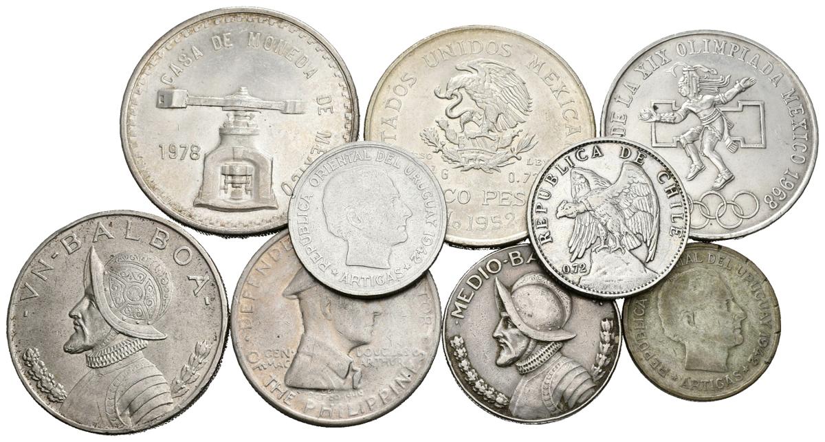 AMERICA CENTRAL-SUR. Lote compuesto por 9 monedas de plata de diversos países. CHILE 1 Peso 1917 Km#152.4; FILIPINAS 1 Peso 1947 Km#185; MEXICO 5 Pesos 1952 Km#467, 25 Pesos 1968 Km#479.1, Onza Troy 1978 Km#M49b; PANAMA 1/2 Balboa 1979 Km#12b, 1 Balboa 1947 Km#13 y URUGUAY 1 Peso 1942 Km#30 (2). Ar. BC-/EBC+. A EXAMINAR.