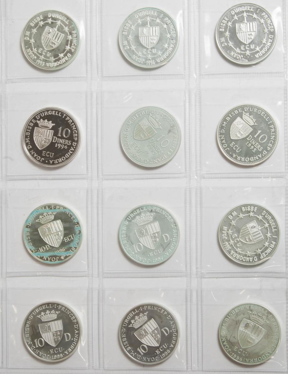 ANDORRA. Conjunto de 12 monedas de Ecu desde el año 1991 hasta el 1998, excepto 1992, incluyendo del 1991: 1 Ecu (Ar 31,56g). Del año 1993: 1 Ecu (Ar 31,49g). Del año 1994: 1 Ecu (Ar 31,45g) y 1 Ecu (Ar 31,49g). Del año 1995: 1 Ecu (Ar 33,48g), 1 Ecu (Ar 31,48g) y 1 Ecu (Ar 31,50g). Del año 1996: 1 Ecu (Ar 33,62) y 10 Ecus (Ar 31,55g). Del año 1997: 1 Ecu (Ar 31,80g). Del año 1998: 10 Ecus (Ar 31,40g) y 10 Ecus (Ar 31,62g). Peso total: 382,44g. A EXAMINAR. PROOF. Todas las monedas sin estuche oficial.