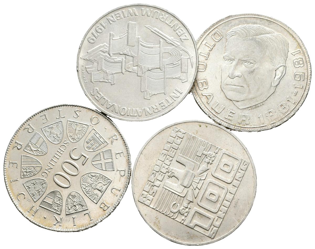AUSTRIA. Lote compuesto por 4 monedas de plata de 100 y 500 Schilling, incluyendo los años 1975, 1979, 1981 y 1982. Ar. MBC+/EBC. A EXAMINAR.