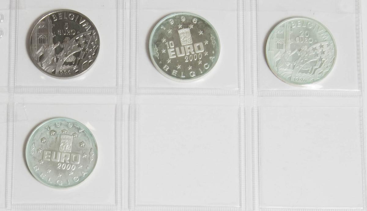 BELGICA. Conjunto de 4 monedas de 1996 y 1997, incluyendo del año 1996: 5 Euros (Ar 22,41g), 10 Euros (Ar 23,09g) y 20 Euros (Ar 22,95g). Del año 1997: 1 Euro (Ar 23,10g). Peso total de plata: 91,55g. A EXAMINAR. PROOF. Todas las monedas sin estuche oficial.