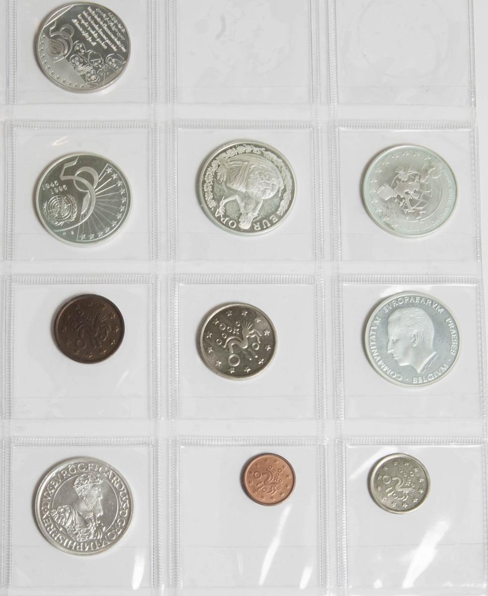 BELGICA. Conjunto de 10 monedas de Ecu desde 1987 hasta 1998, excepto 1988, 1989, 1990, 1992, 1994 y 1996, incluyendo del año 1987: 5 Ecus (Ar 22,69g). Del año 1991: 1 Ecu (Ae 3,99g), 2 Ecus (Ae 5,35g), 5 Ecus ( Ae 7,33g) y 10 Ecus (Ar 22,10g). Del año 1993: 5 Ecus (Ar 22,83g). Del año 1995: 5 Ecus (Ar 23,01g) y 25 Ecus (Plata esmatada 24,06g). Del año 1997: 5 Ecus (Ar 23,01g). Del año 1998: 5 Ecus (Ar 23,13g). Peso total de plata: 158,54g. A EXAMINAR. PROOF. Todas las monedas sin estuche oficial.