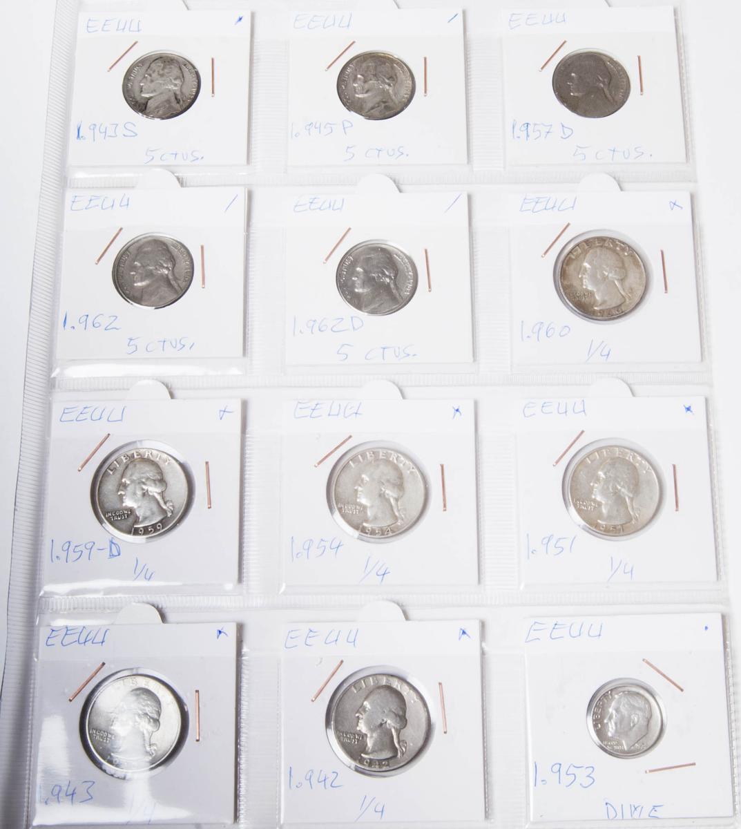 ESTADOS UNIDOS. Lote compuesto por 30 monedas, inicio de colección compuesta por 1/4 Dollar 1942, 1943, 1951, 1954, 1959D y 1960; 1 Dime 1943, 1944 (2), 1945, 1947S, 1950 y 1953; 5 Cents 1938S, 1939, 1939S, 1940, 1941S, 1943, 1943S, 1945P, 1957D, 1962 y 1962D; 1 Cent 1944S, 1956D, 1957D, 1958D, 1962D y 1964D. Numerosas de plata. MBC-/EBC. A EXAMINAR.