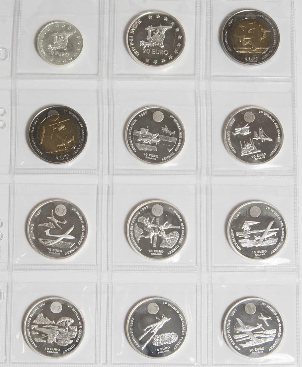 FINLANDIA. Conjunto de 15 monedas de Euro desde 1996 hasta 1997, incluyendo del año 1996: 10 Euros (Ar 14,42g) y 20 Euros (Ar 27,07g). Del año 1997: 5 Euros (Ar 23,13g), 5 Euros (Ar 23,14g), 10 Euros (Ar 27,25g), 10 Euros (Ar 27,40g), 10 Euros (Ar 27,71g), 10 Euros (Ar 27,05), 10 Euros (Ar 27,08), 10 Euros (Ar 27,08g), 10 Euros (Ar 27,32g), 10 Euros (Ar 27,59g), 10 Euros (Ar 27,16g), 10 Euros (Ar 27,70g) y 50 Euros (Ar 27,15g). Peso total de plata: 388,25g. A EXAMINAR. PROOF. Todas las monedas sin estuche oficial.