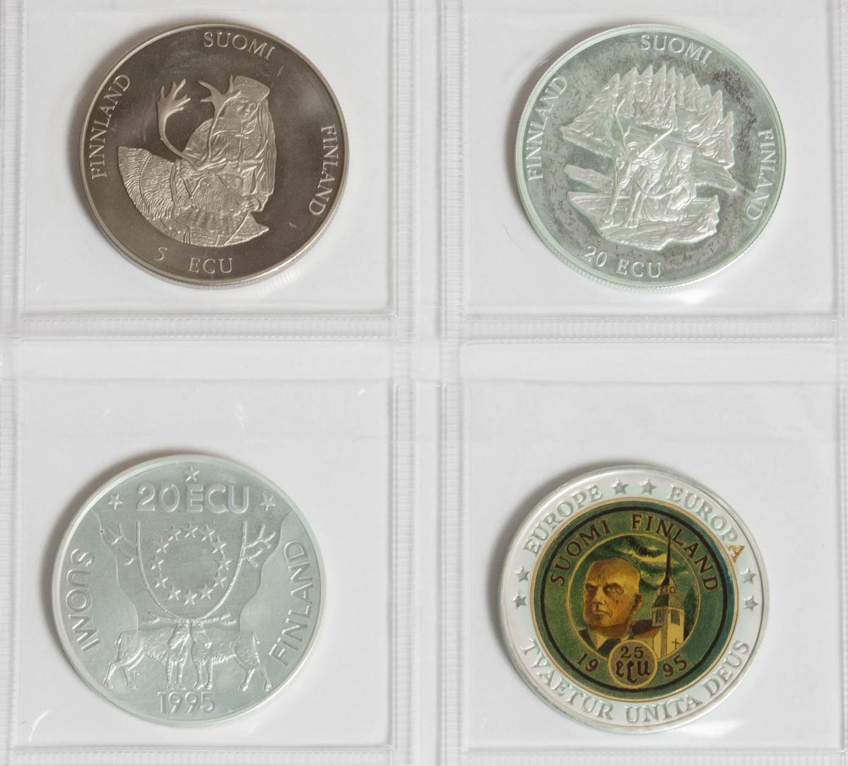 FINLANDIA. Conjunto de 4 monedas de Ecu desde el año 1994 hasta el 1995, incluyendo del año 1994: 5 Ecus (Ar 26,52g) y 20 Ecus (Ar 25,01g). Del año 1995: 20 Ecus (Ar 27,22g) y 25 Ecus (Plata esmaltada 24,26g). Peso total de plata: 103,01g. A EXAMINAR. PROOF. Todas las monedas sin estuche oficial.