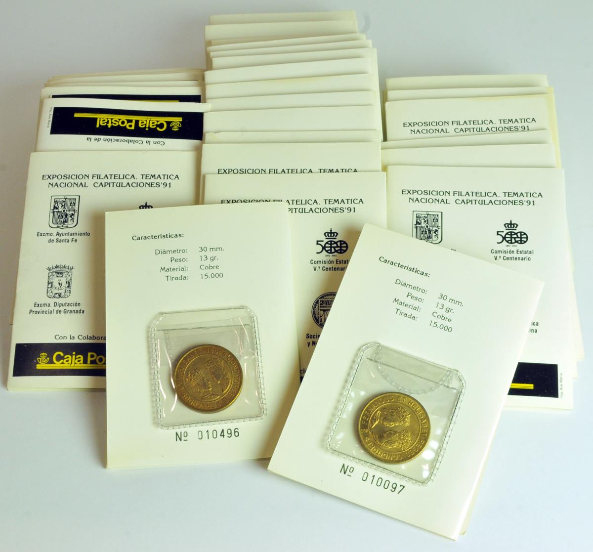 FUNDACION DE SANTA FE (GRANADA). Lote compuesto por 36 Carteras oficiales de la medalla conmemorativa por la fundación de Santa Fé (Granada) 1491-1991, V Centenario. Cu. 30mm. SC.