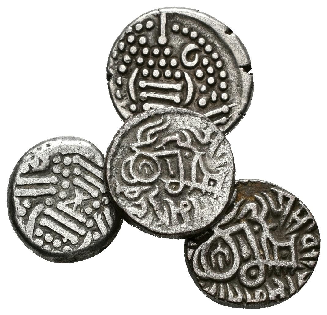 INDIA. Lote compuesto por 4 Dracmas. Conteniendo dos de Valabhi (Saurashtra). Finales del siglo V al VIII y dos de Spalapati Deva. 750-900 d.C. Jital. Ar. BC+/MBC+. A EXAMINAR.