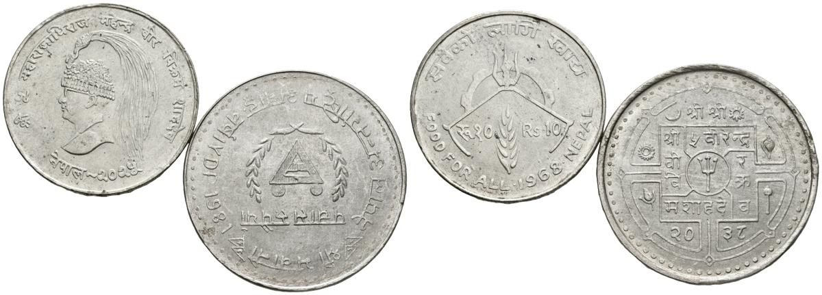 NEPAL. Lote compuesto por 2 monedas de Plata: 10 Rupee. 2025 (1968). Km#794 y 50 Rupee. 2038 (1981). Km#843. Ar. MBC+/EBC.