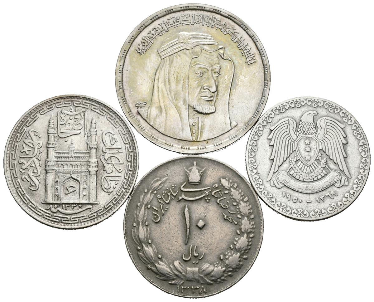 PAISES ARABES. Lote compuesto por 4 monedas de plata de diferentes países. EGIPTO 1 Pound Km#457; HYDERABAD Rupia Km#53; IRAN 10 Rials Km#132 y SIRIA 1 Lira 1950 Km#85. Ar. MBC-/EBC. A EXAMINAR.
