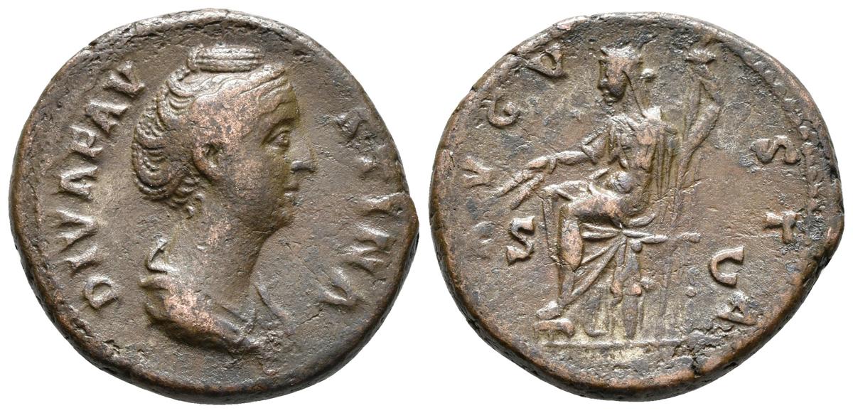 FAUSTINA I. As. 140-141 d.C. Roma. A/ Busto drapeado a derecha. DIVA FAVSTINA. R/ Ceres sedente a izquierda portando antorcha larga y espigas con granos. AVGVSTA, en el campo S C. BMC 1578; Cohen 107; RIC 1170. Ae. 11,98g. MBC.