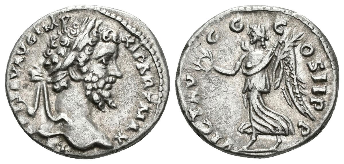 SEPTIMIO SEVERO. Denario. 198-202 d.C. Laodicea. A/ Busto laureado a derecha. L SEPT SEV AVG IMP XI PART MAX. R/ Victoria avanzando a izquierda portando corona y palma. VICT AVGG COS II P P. RIC 498var. Ar. 3,25g. MBC+. Escasa.
