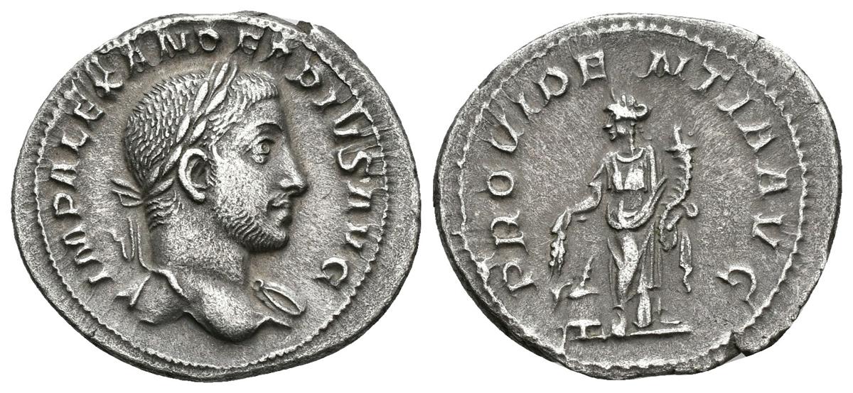 ALEJANDRO SEVERO. Denario. 221-235 d.C. Roma. A/ Busto laureado a derecha con ligero drapeado sobre el hombro izquierdo. IMP ALEXANDER PIVS AVG. R/ Providentia estante a izquierda portando cornucopia y espigas con granos sobre modio en el suelo. BMC 875; Cohen 501var (draped); RIC 250. Ar. 2,98g. EBC-/MBC+.