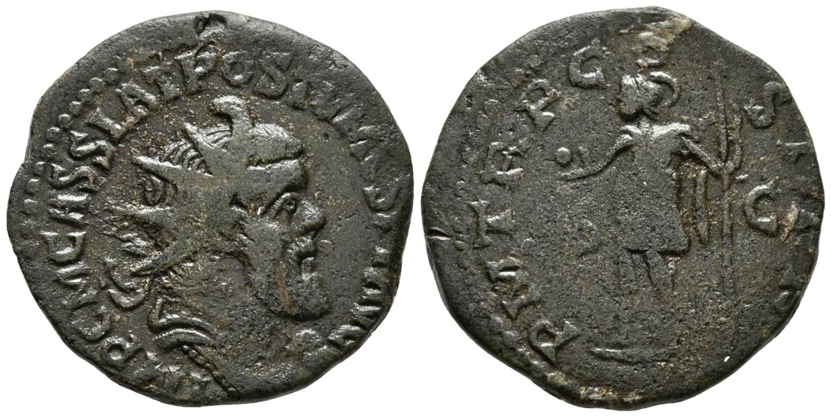 POSTUMO. Sestercio. 261 d.C. Colonia. A/ Busto radiado y drapeado con coraza a derecha. IMP C POSTVMVS P F AVG. R/ Póstumo a izquierda con atuendo militar, portando lanza y globo. P M TR P COS II P P. RIC 107. Ae. 15,19g. MBC/MBC-. Escasa.